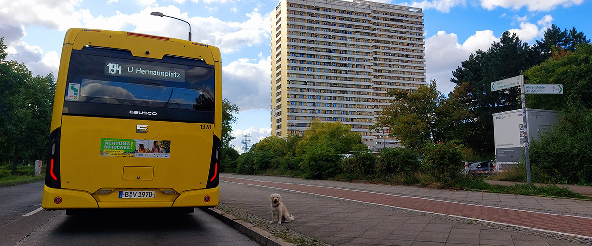 Die Buslinie 194 stoppt am Helene-Weigel-Platz. Heißt: einfach aussteigen, Springpfuhl-Passage suchen, Theater finden, lachen!